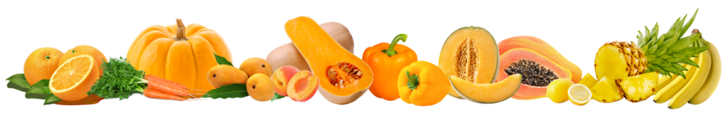 Examples: oranges, carrots, pumpkin, mangoes, peaches, butternut squash, orange and yellow bell peppers, cantelope, papaya, lemons, pineapple, and bananas.